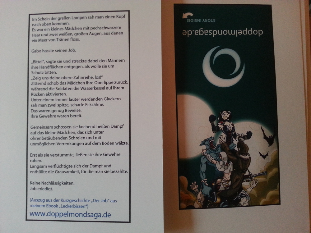 Auf der Innenseite habe ich noch einen Auszug aus einer meiner Kurzgeschichten abgedruckt.